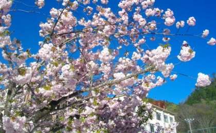 ポンポンのようにたくさんの花びらをつける八重桜。今が満開です。