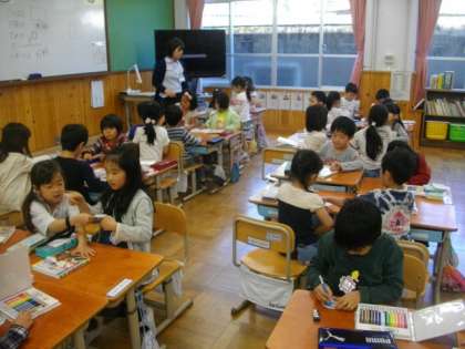 1年生は,青空のもと,元気いっぱいに体育に取り組んでいます。そのあと,4時間目に教室でカード作りに取り組んでいます。