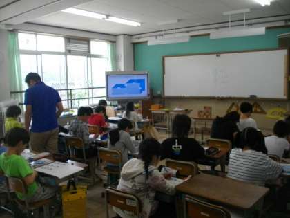 3年生は,算数の時間に,問題の解き方をホワイトボードにまとめてから,よりよい解き方について考えています。同じく5年生は,体積の求め方を学習しています。テレビには,「市原野小学校の校舎の体積」を求めるためのヒントが映し出されています。