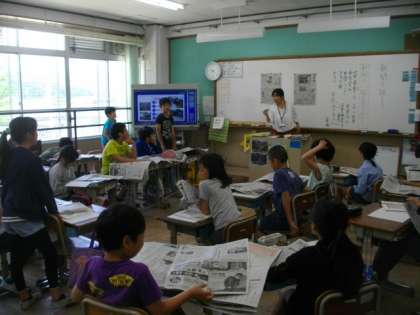 5年生は,国語の学習で新聞を活用しています。新聞の一面を見て,気が付いたことを話し合っています。