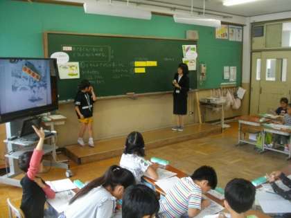 2年生は,2匹の魚の長さをくらべるためにどうしたらいいのか,話し合っています。3年生は,線分図を使って問題の意味を考えています。
