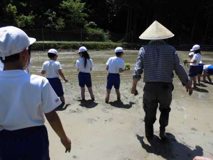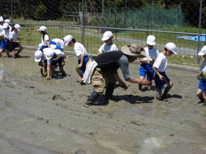 苗を3本ずつ手にとり,植えながら後ろに進んでいきます。どんどん上達してまっすぐに植えれるようになってきました。これから成長を観察し,秋には収穫体験をさせていただきます。