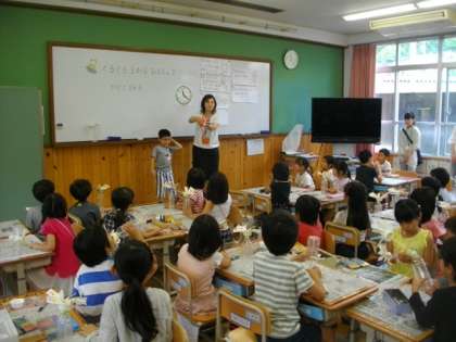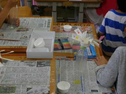 1年生は,図画工作科で,くるくるまわる風車作りに挑戦しています。