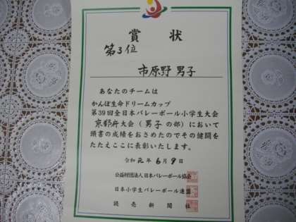 バレーボール部は,9日に行われた第39回全日本バレーボール小学生大会京都府大会(男子の部)において,第3位の成績をおさめました。