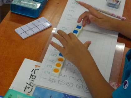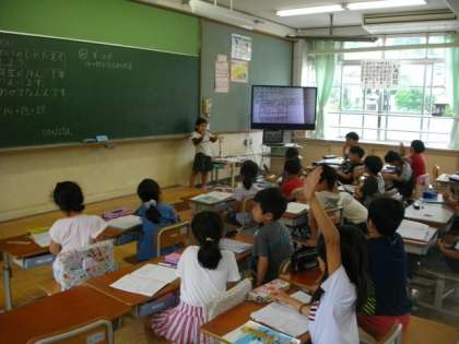1年生は,数図ブロックを使ってたし算の学習を進めています。2年生は,算数の時間に自分の考えを表現するために,大型テレビを使って説明をしています。