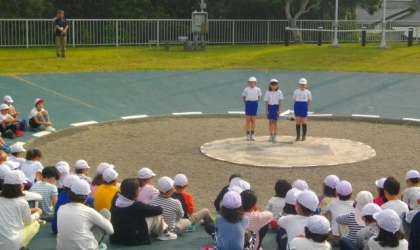 朝の集いでは、4校があつまり、学校紹介をしました。