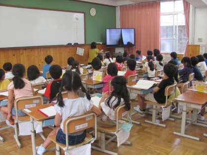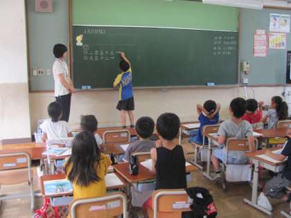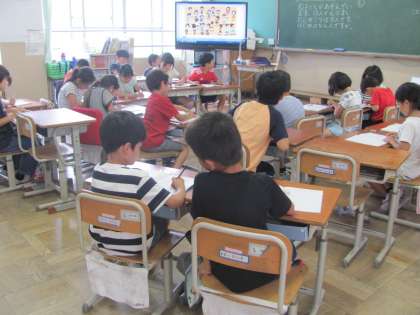 1年生は国語科で,拗音の学習をしています。「きゅうり」や「きゅうきゅうしゃ」など自分が思いついた言葉を,ノートに書いています。2年生は,算数科の学習をしています。
