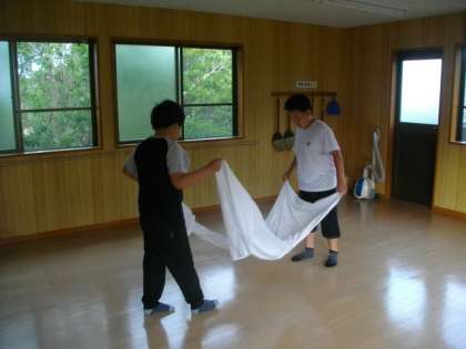 友達と協力しながらシーツをたたんだり、ふとんを片づけたりしています。シーツのたたみ方は、事前に練習をしていたので、段取りよく取組めています。