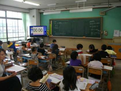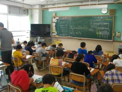 太陽が照りつけていますが,さわやかな風がふいているので,過ごしやすい状況です。子どもたちはとても集中して学習をしています。(3年生の教室の様子です。)