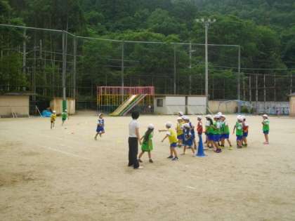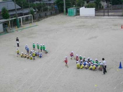 2年生が,体育でリレーをしています。応援の声が運動場いっぱいに響いています。