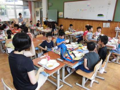 違うクラスのお友達や先生,給食調理員と楽しく会食をしました。