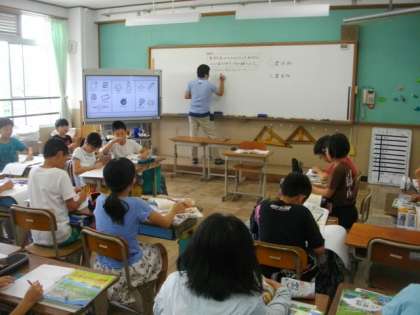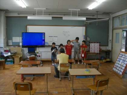 3組は,一列に並んで発表の練習をしています。5年生は,社会科の学習で農作物について調べています。
