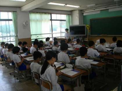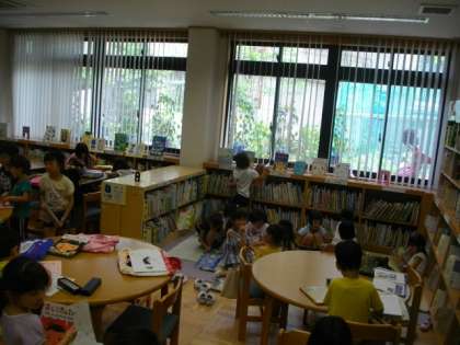 6年生は,音楽でリコーダーの練習をしています。1年生は本を選んでいます。