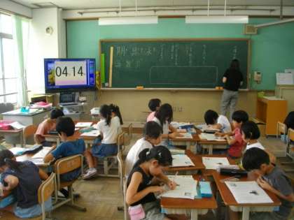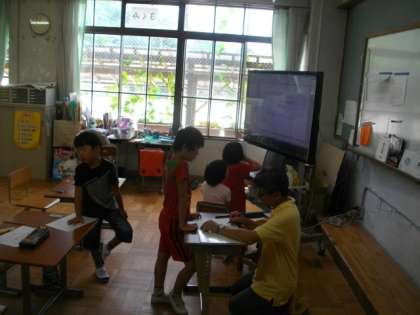 3組は,出来上がった算数プリントをもって並んでいます。3年生は,国語の学習でノートづくりに取り組んでいます。
