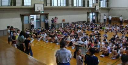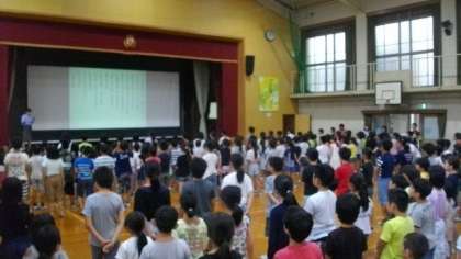 いちょうタイムを体育館で行いました。縦割り班で並び,今月の歌をみんなで歌いました。