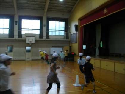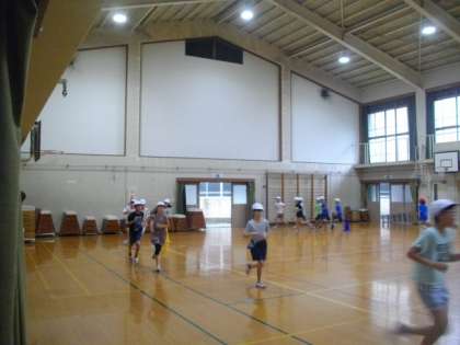 雨模様のため,朝ランニングを体育館で行いました。