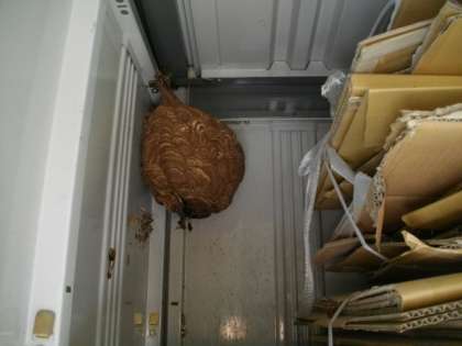 古紙倉庫の中に,ハチの巣が見つかりました。ずいぶん古いもののようです。先週,駆除剤を使用し,本日保健所の方の指導のもと,撤去しました。