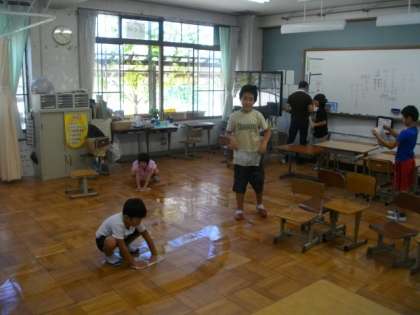 階段や教室の掃除,運動場の石ひろいを進めています。
