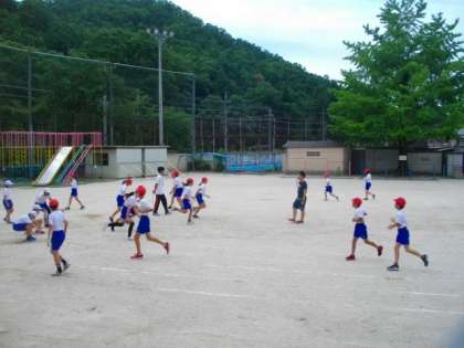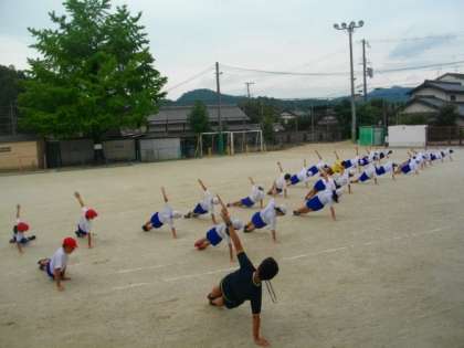5,6年生は,集団演技の技の部分練習や,徒競走の練習を運動場で行っています。