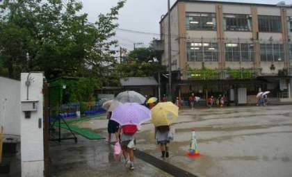 雨が降っています。子どもたちが元気よく登校してきました。