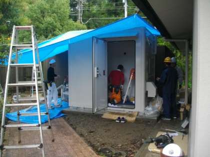 大気の固定監視局の建物の中の器材の搬入が始まりました。