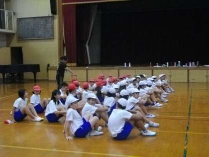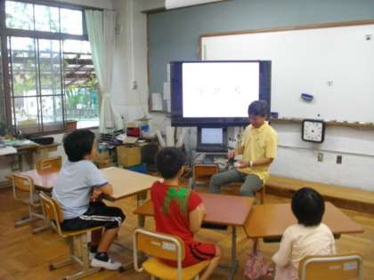 3組は,テレビ画面にでる画像をおみながらいろいろなパターンの足し算の学習をしています。5年生は集団演技の練習をしています。