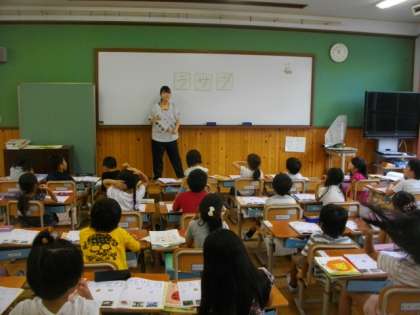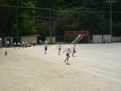 1年生が,カタカナの練習をしています。3年生は,運動場で80m走の練習をしています。
