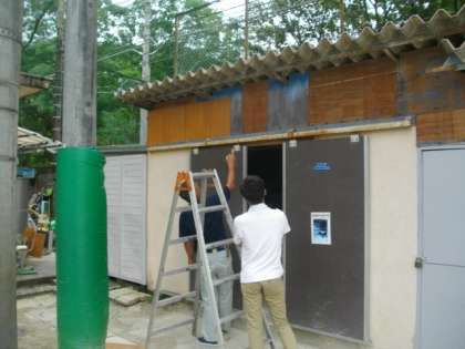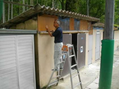 体育倉庫の壁面の修理と塗装を進めています。