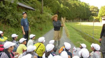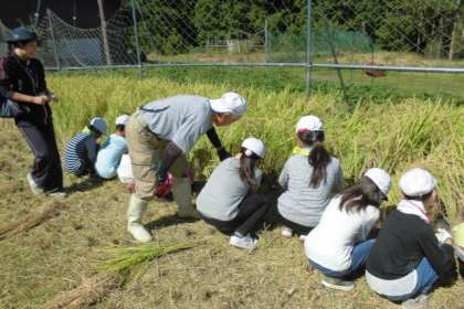 3年生が,収穫体験をしました。5月に植えた苗が大きく育ちました。かまをもって丁寧に刈っていきます。