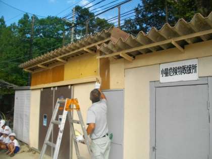 体育倉庫の塗装を進めています。