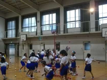前半は,「エアー玉入れ」で練習しましたが,後半は「玉入れ」をしました。