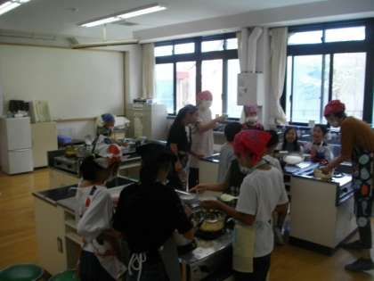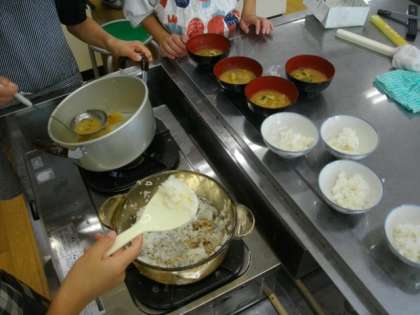 5年生が家庭科で調理実習に取り組んでいます。ご飯をたいたり味噌汁をつくったりしました。