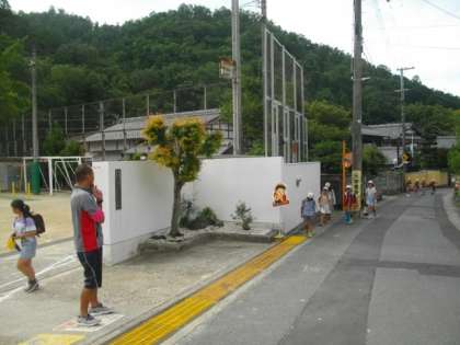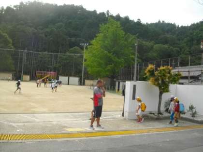 曇り空です。子どもたちが登校してきました。