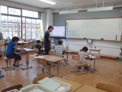 3組お話の絵を描いています。まず,かばくんのおしりを大きく描いて,その後に他の生き物を描いていっています。