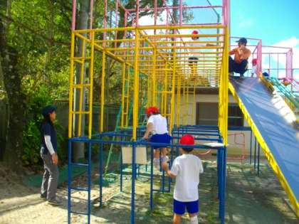 3組は体育を総合遊具を使って進めています。5年生は,熟語の成り立ちについて学習をしています。