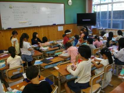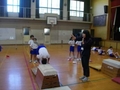 3年生は跳び箱運動に取り組んでいます。1年生は,算数の学習に取り組んでいます。