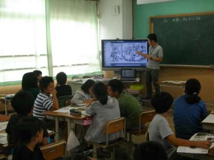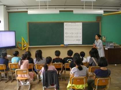 4年生は音楽で「ゆかいにあるけば」を歌っています。6年生は社会科の学習をしています。