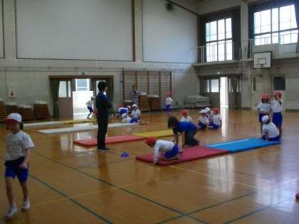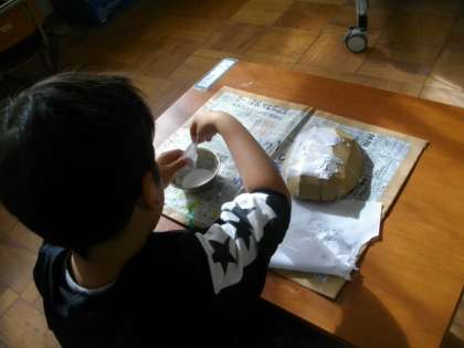 2年生の体育の様子です。3組ではお面づくりに取り組んでいます。どんな顔ができるかな。