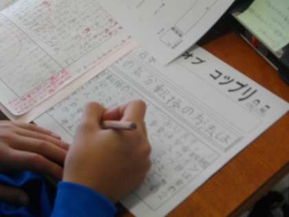 6年生は,毎日宿題で「こつこつプリント」(通称:こつプリ)に取り組んでいます。テーマを決めて160字から200字くらいで,自分の意見や考えを書きまとめるものです。順序良く書く方法や,話題を2,3に絞って書く(ナンバリング)方法を身につけて簡潔に書きまとめることができるようになってきました。毎日続けることで確実に文章力が伸びていることが伝わってきます。