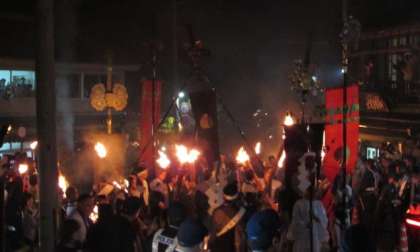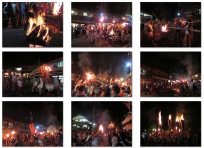「鞍馬の火祭」が鞍馬・由岐神社と神社に続く鞍馬街道を中心に集落一帯で行われました。午後6時,各家の軒先に置かれたかがり火がともされ,続いて小さな松明をもった子どもたちが「サイレイヤ,サイリョウ」と掛け声をあげて地域を練り歩きます。そのあと,勇ましい掛け声と共に大人が数人がかりで担ぐ大松明や剣鉾が加わり,無数の炎が街道を行き交います。午後8時半過ぎには大松明が鞍馬寺山門前に並ぶと熱気は最高潮に達しました。(京都市登録無形民俗文化財にも登録されている本火祭には,本校の子どもたち,保護者,地域の方々が参加されており,準備をはじめとする運営にも数多くの方々が携わっておられます。)