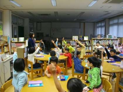 3組は算数の学習をしています。1年生は図書館で学習しています。