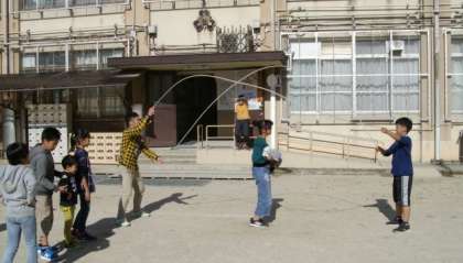 先生がなわとびの縄を回したり,鬼ごっこのおにになったりして遊んでいます。6年生は,なわとびでダブルダッチにチャレンジしていました。
