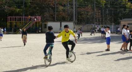 一輪車に乗ることができる先生は,子どもといっしょに新技に挑戦しています。
