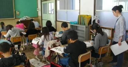 隣のクラスでは習字に取り組んでいます。