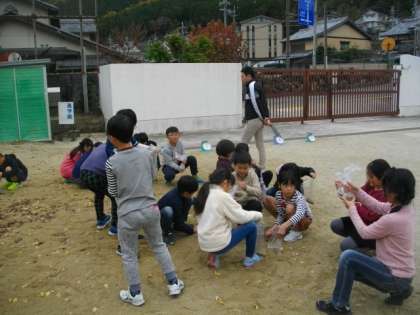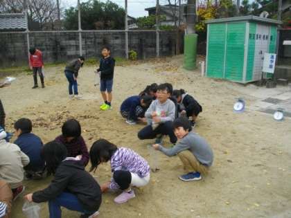 3年生は算数科で1000グラム重さについて学びました。袋に砂を実際につめて,1000グラムを予想しました。