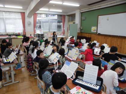 1年生は,音楽科でけんばんハーモニカの演奏を楽しみました。きらきら星を階名唱をしたあと,みんなで演奏をしました。