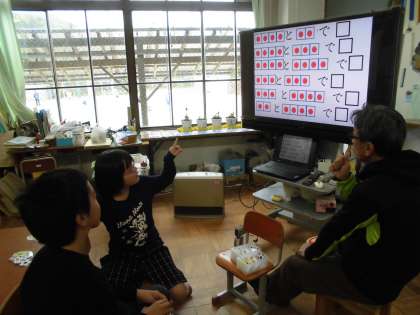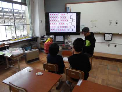 3組では,算数科で足し算の学習をしました。モニターに出された,数図ブロックを数えて計算したり,瞬時に答えたりしました。