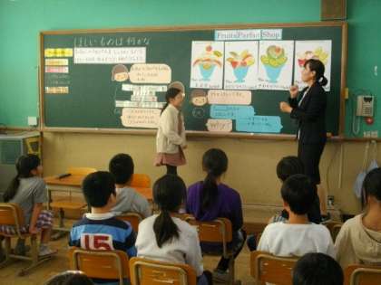 4年生の外国語活動の様子です。お気に入りのパフェを作り,お店担当をしたりお客担当をしたりして,食べてみたいパフェを選んでいます。