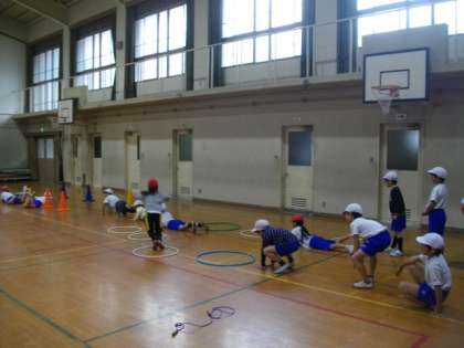 2年生は,運動場と体育館にわかれて学習中です。運動場のサッカーは,静原小学校のお友達もいっしょに学習しています。