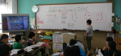5年生は,算数で「単位量当たりの大きさ」について学習しています。どの部屋が一番混んでいるかを,図を使いながら説明している場面です。